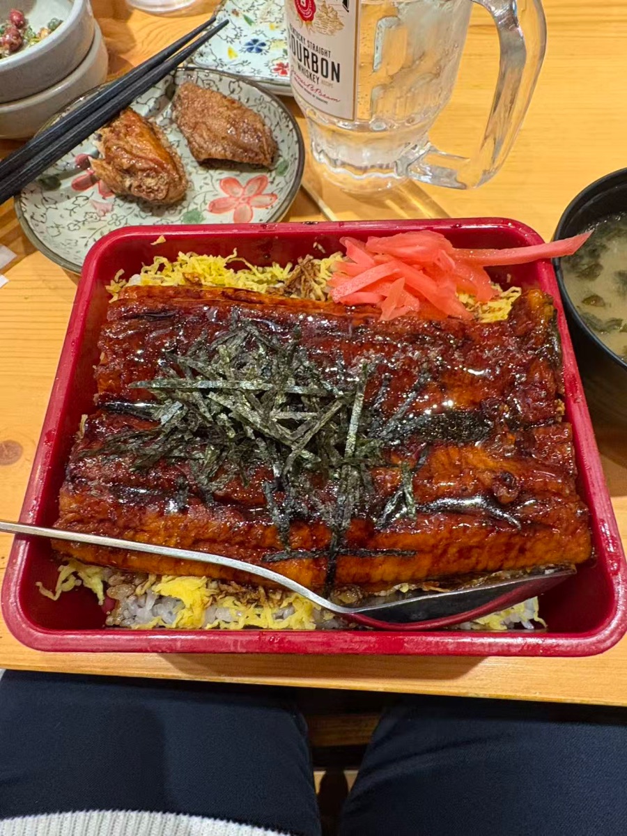 黝黑发亮的漆器木盒里,一切静穆如仪式。掀开盖,热气与浓香轰然而起,不是扑面,是笼罩。蒲烧鳗鱼躺得郑重,酱汁是油亮的琥珀色,光在表面缓缓流动,像是活的。底下米饭雪白晶莹,每一粒都吸饱了酱香与油脂,静待着被唤醒。